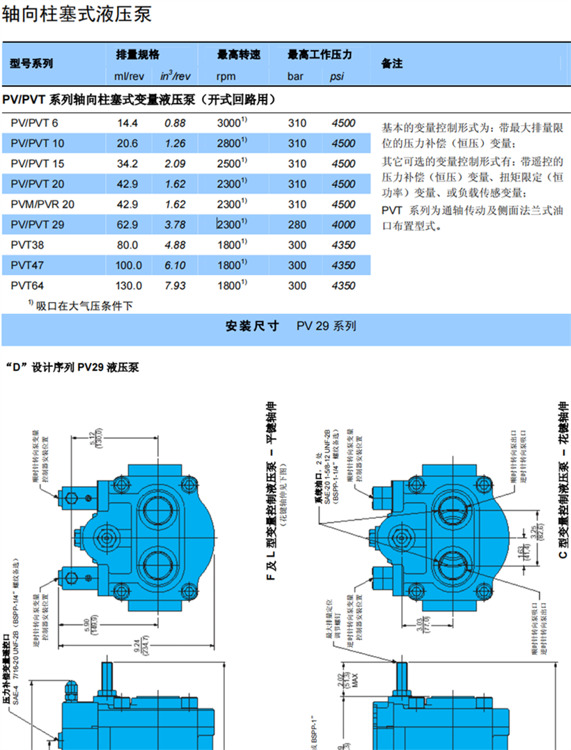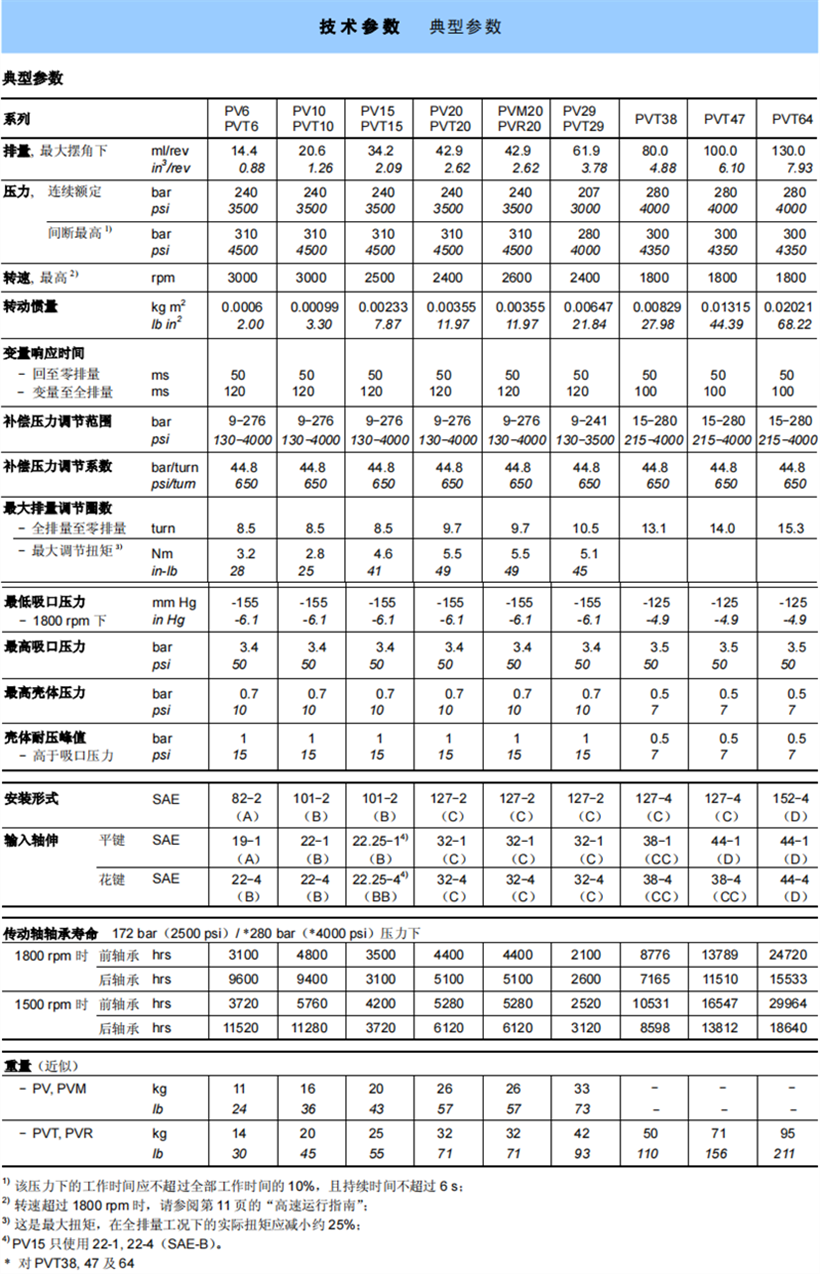 PV 系列泵是可变排量开路活塞泵,其设计重点是运行经济性。这些用于开环操作的轴向柱塞泵适用于 PVT 系列配置中的后驱动。PV 泵的排量为 0.88 至 7.93 cu。英寸/转。(14,4 至 130,0 cc/rev.),连续工作压力高达 4000 psi (280 bar):泵可配备压力补偿器、可通风补偿器、负载感应或功率限制控制。