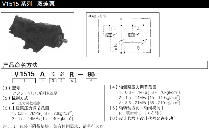 发布时间:2022-12-01 10:19:52 浏览次数:1176大金V1515系列双连泵型号说明: