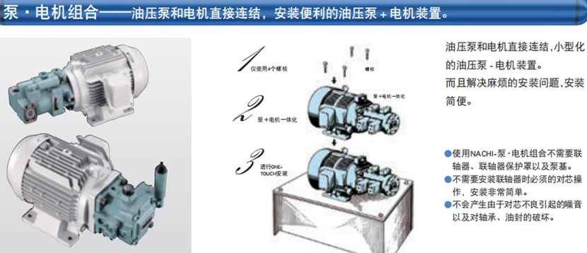 油压泵和电机直接连结,小型化的油压泵 ? 电机装置。而且解决麻烦的安装问题,安装简便。